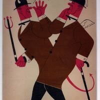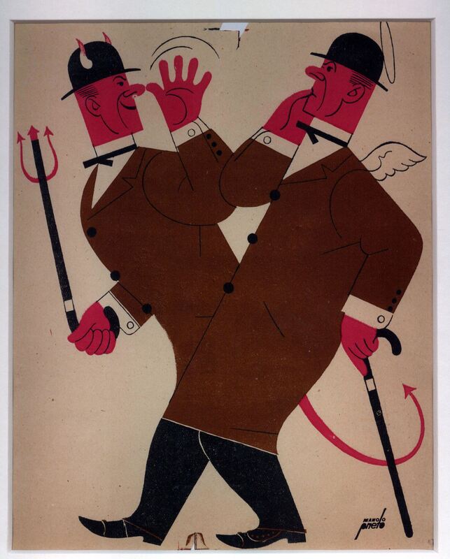 En este dibujo enmarcado destacan dos figuras vestidas, de la misma manera, con un traje de larga chaqueta marrón, camisa blanca con la pajarita negra al igual que el pantalón. Ambos llevan sombrero negro y bastón. Estas figuras son un diablo, con los cuernos que sobresalen del sombrero y rabo, que con un gesto burlón asombra al otro que es el ángel, con una aureola sobre el sombrero y unas alitas a la espalda blancas. Inferiormente en la parte izquierda se encuentra la firma del pintor.Prueba de imprenta. Ilustración realizada para la revista semanal de Novelas y Cuentos. Titulo: El doble. Autor: Fedor Dostoieski. Nº publicado: 925. Fecha: 30-01-1949. Tomo NC.: 1.