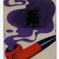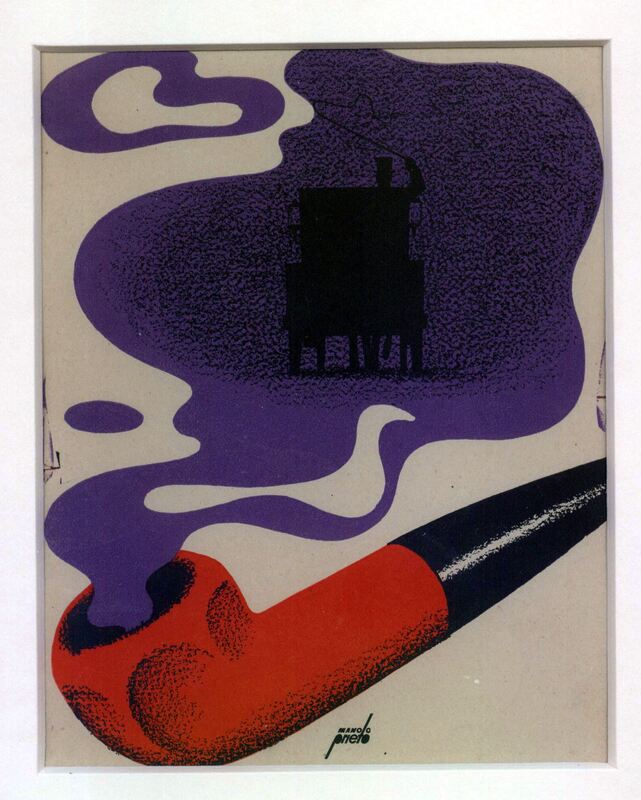 En el dibujo enmarcado en donde destaca la firma del artista se ha representado una pipa roja que desprende un humo de color morado, en cuyo interior se ha dibujado un coche de caballos, como se puede ver en la parte superior con un cochero guiándolo.Prueba de imprenta. Ilustración realizada para la revista semanal de Novelas y Cuentos. Titulo: Autor: Nº publicado: Fecha: Tomo NC.: