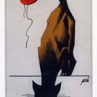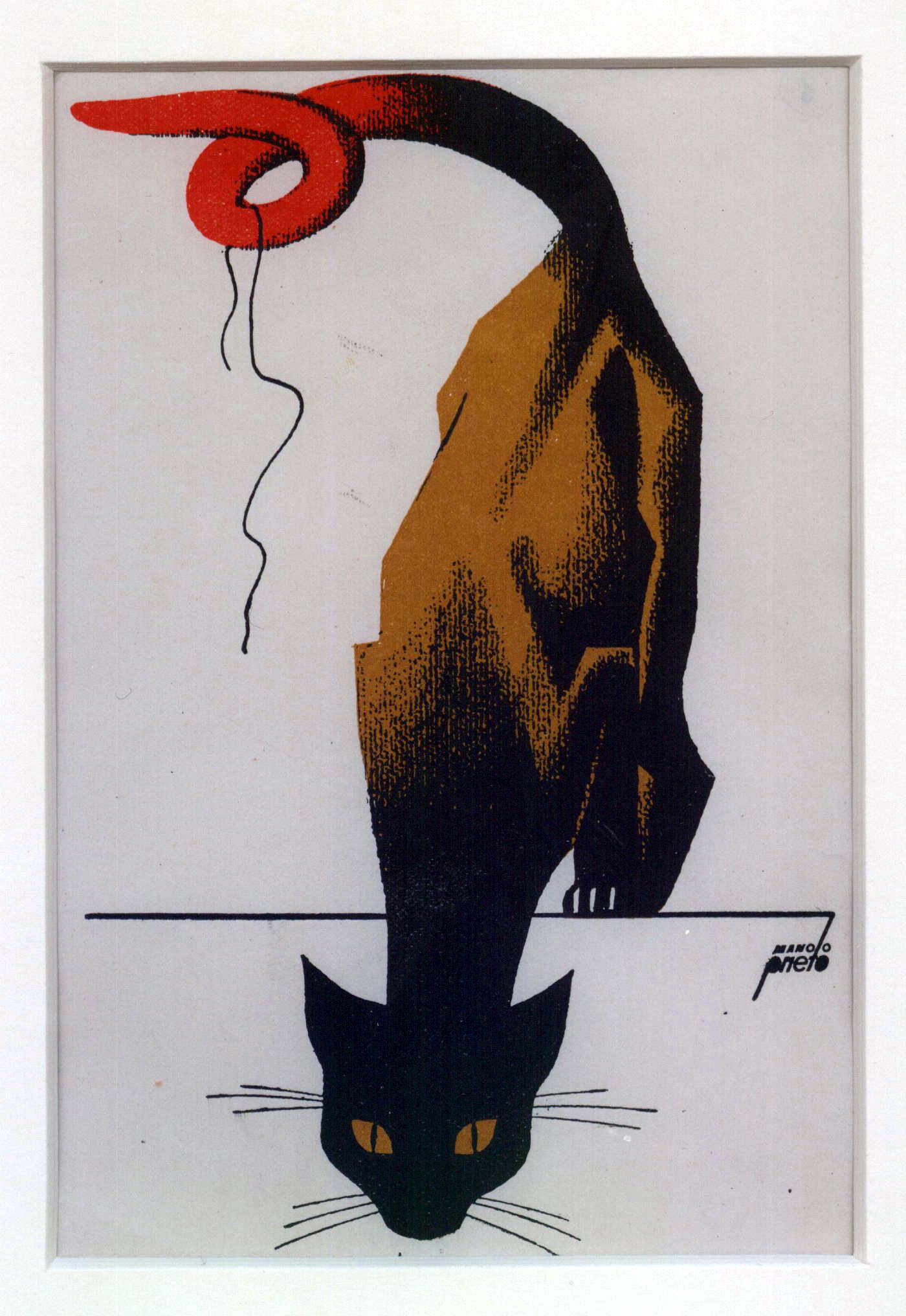 Un gato marrón y negro con la punta roja del rabo, del que cuelga un hilo, en una graciosa forma parece saltar de un muro u observar alguna cosa de su interés. Esta es la figura que se representa en este dibujo enmarcado y firmado por el artista.Prueba de imprenta. Ilustración realizada para la revista semanal de Novelas y Cuentos. Titulo: El secreto de una modistilla. Autor: Gustavo Le Rouge. Nº publicado: 1231. Fecha: 12-12-1954. Tomo NC.: 41.