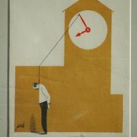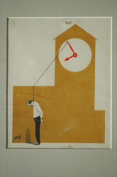 Prueba de imprenta.- La fachada de una casa con torre, en la torre un reloj el reloj marca las ocho menos cinco de la aguja del reloj de los minutos cuelga una cuerda y en la parte inferior de la cuerda un hombre con la soga al cuello La firma parte inferior izquierda.Imprenta. Ilustración realizada para la revista semanal de Novelas y Cuentos Prueba de. Titulo: La casa misteriosa. Autor: Beuce Hamilton. Nº publicado: 1263. Fecha: 24-07-1955. Tomo NC.: 43.