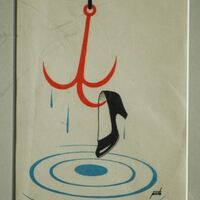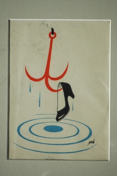 - Un ancla, del ancla cuelga un zapato de tacón de mujer cayendo unas gotas del otro brazo del ancla, el agua representado por un ponto azul y unos círculos del mismo color. La firma al lado derecho de la parte inferior.Prueba de imprenta. Ilustración realizada para la revista semanal de Novelas y Cuentos. Titulo: La mujer en el umbral. Autor: Warnick Deeping. Nº public ado: 1317. Fecha: 05-08-1956. Tomo NC. 28