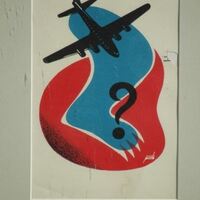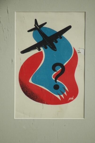 En este dibujo se observa un avión de color negro con resaltes azules, como una pista de aterrizaje que parece la pata de un oso en azul, con una interrogación donde las garras en negro toda la pata recortada con blanco, y por último en el fondo, una mancha roja en la que está situada la firma del artista.Prueba de imprenta. Ilustración realizada para la revista semanal de novelas y Cuentos. Titulo: Autor: Nº publicado: Fecha: Tomo NC.: --