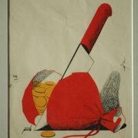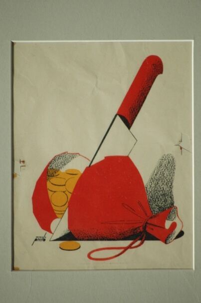 Representa una bolsa roja tumbada en horizontal con monedas, cortada por un cuchillo por la mitad, la bolsa roja el contenido ocre, hoja cuchillo blanca empuñadura roja, la guita que cierra la boca de la bolsa ocre. La sombre del saco y cuchillo en negro y gris. La firma del artista presente en la parte inferior.Prueba de imprenta. Ilustración realizada para la revista semanal de Novelas y Cuentos. Titulo: Los dos hermanos. Autor: Erkman Chatrian. Nº publicado 1119. Fecha: 19-10-1952. Tomo NC. 35.