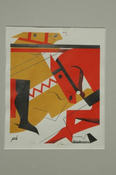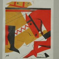 Dos caballos luchando en un torneo al de la izquierda se le ve ataviado con un faldón color ocre una franja blanca con unas líneas rojas, una pierna del caballero vestida con una calza negra el faldón en rojo, la lanza en rojo. El otro caballo en rojo, los correajes del caballo en negro ojo y nariz en negro, la lanza en negro. La firma en la parte inferior izquierdaPrueba de imprenta. Ilustración realizada para la revista semanal de Novelas y Cuentos. Titulo: Tristán e Iseo. Autor: Anónimo. Fecha: 28 12 1952. Nº publicado: 1129. Tomo: 56. BO/. 278. PI/.