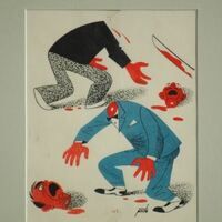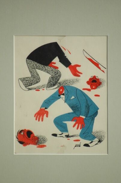 - Dos hombres uno de traje azul en la parte inferior y el otro vestido con pantalón gris y jersey negro, al lado derecho una hoja de espada teñida de rojo en el suelo las dos cabezas cortadas los hombres con gesto de estar buscando sus cabezas, las cabezas con gesto de sorpresas. La firma en la parte inferior a la derecha.