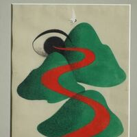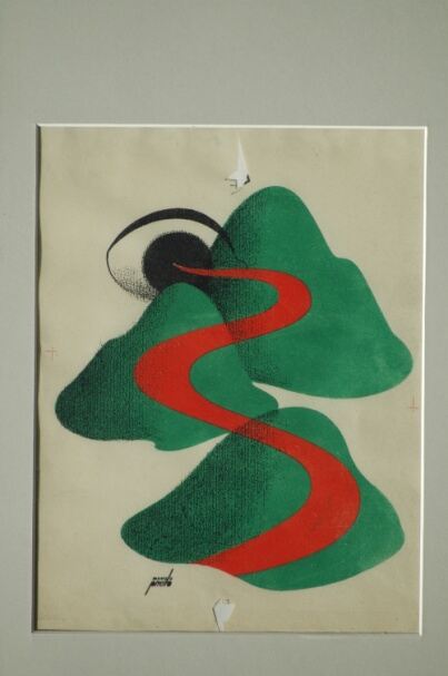 Aparece al fondo a la izquierda un ojo del que sale un camino rojo que recorre tola la ilustración de arriba abajo. Por delante del ojo aparece una montaña continuada por otras dos, la firma abajo.Prueba de imprenta. Ilustración realizada para la revista semanal de Novelas y Cuentos. Titulo: La maga de la montaña. Autor: Walter Scott; Nº publicado: 965 Fecha: 06-11-49; Tomo NC.08 - revista: Si