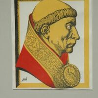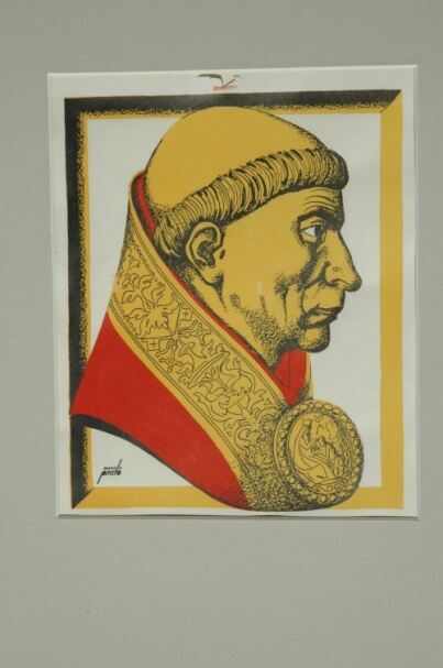 - El retrato de perfil de un cardenal mirando hacia la izquierda, los colores en ocre, la cara del mismo color, cuello en rojo, y todo ello enmarcado con un marco dibujado en ocre y negro. La firma en la parte inferior derecha.Prueba de imprenta. Ilustración realizada para la revista semanal de Novelas y Cuentos. Titulo: Autor: Nº publicado: Fecha: Tomo NC.: