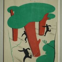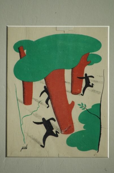 - Se representa tres hombres corriendo, dibujados en negro, entre tres árboles, dibujado los troncos en marrón, sobre ellos unas manchas verdes y otra mancha verde debajo de la ilustración. La firma se encuentra en la parte inferior.Prueba de imprenta. Ilustración realizada para la revista semanal de Novelas y Cuentos. Titulo: TON SAWYER, DETECTIVE. Autor: MARK TWAIN; FECHA 24 09 1950; Nº 1011 TOMO 28