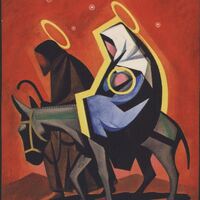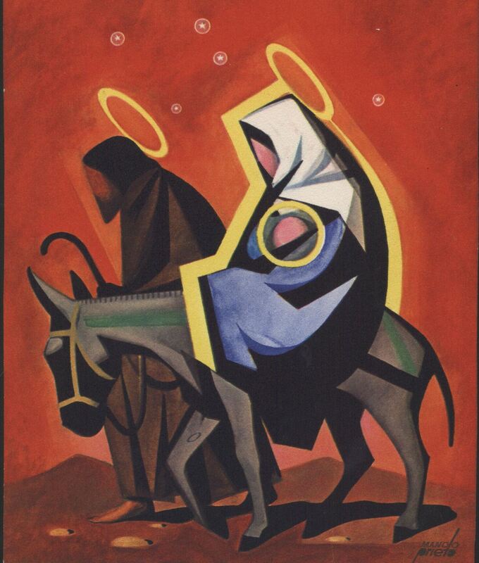 - En este dibujo firmado y sobre un fondo rojo se ve de perfil a la Sagrada Familia. La Virgen, con túnica azul y manto blanco sobre la cabeza, va con su Niño en brazos sobre un burro gris oscuro y San José con una túnica marrón lo lleva. Sobre sus cabezas destacan tres grandes y amarillas aureolas.