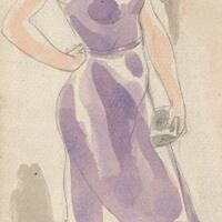 - Figura de una mujer de frente al espectador cuya cabeza está vuelta hacia la sombra proyectada en la pared, lleva un traje en tonos violetas y en una de sus manos sujeta un pequeño bolso oscuro.