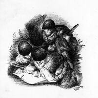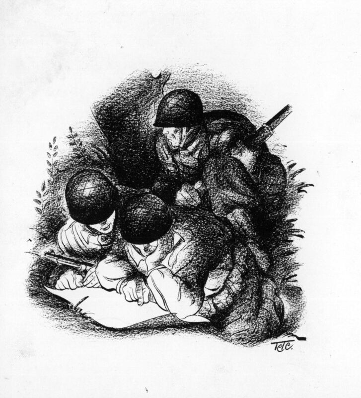 - Imagen compuesta por tres soldados en una trinchera, dos de ellos juntos, estudiando un plano y su compañero atento a la reflexión, en un tercer término la figura de un soldado agazapado, vigilando, cubriendo a sus compañeros.