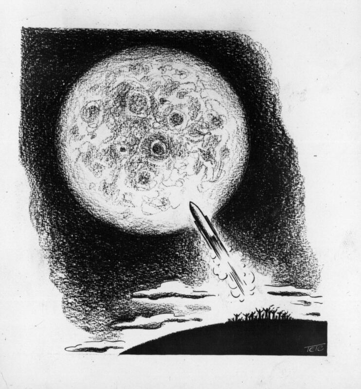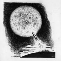 - Escena en blanco y negro, de una gran luna hacia donde se dirige un cohete espacial, símbolo de una era, de la investigación y desarrollo para el conocimiento espacial, y el deseo del hombre de llegar y conquistar la luna y mucho más.