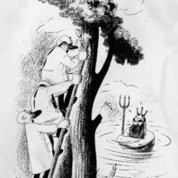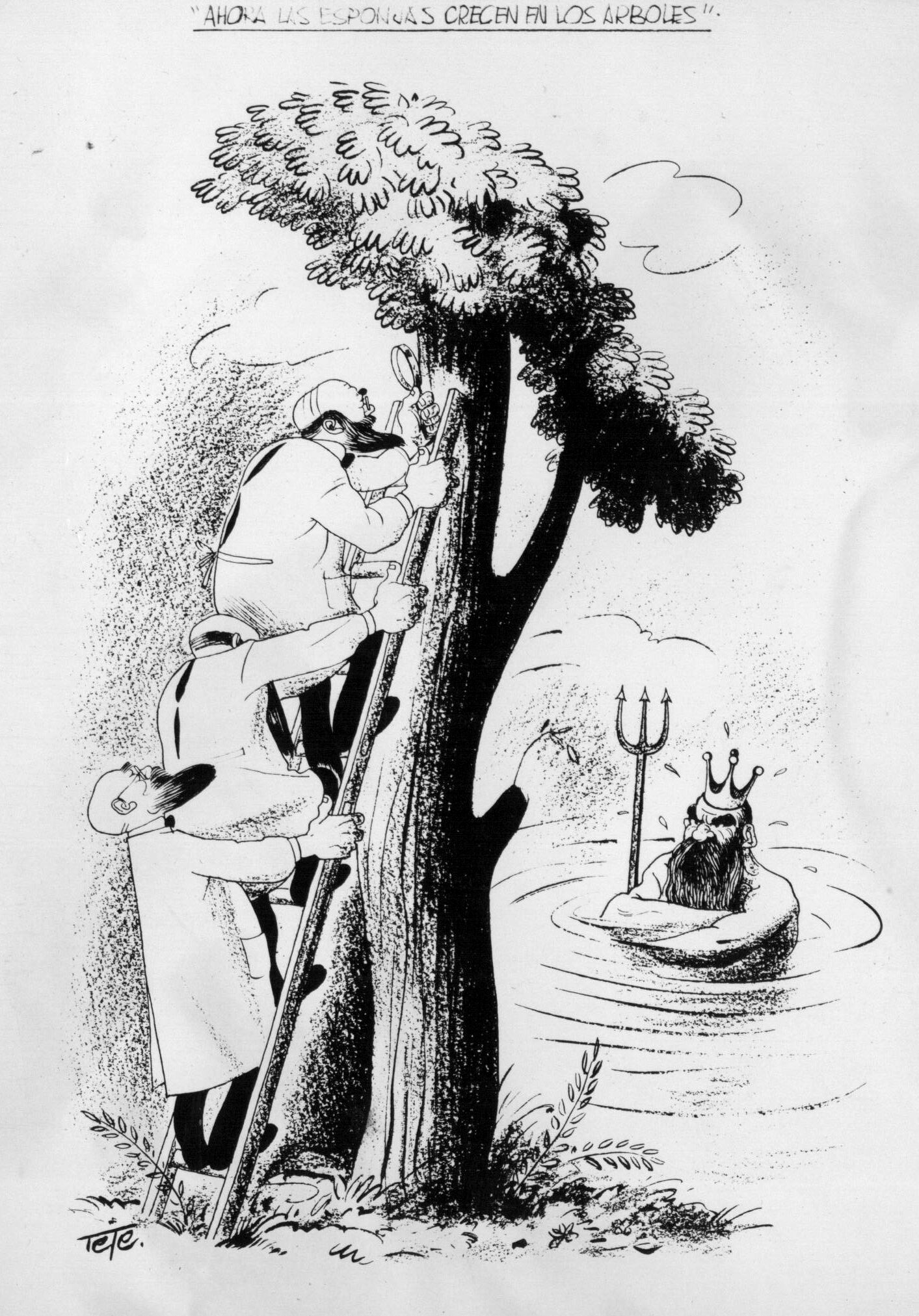 - Imagen con tres científicos estudiosos con sus batas subiendo por una escalera a un árbol, para observar con lupa las hojas, con un rótulo que dice “ahora las esponjas crecen en los árboles”, y la imagen del dios Neptuno con su tridente cruzado de brazos con cara seria mirando atento la escena.