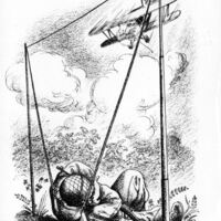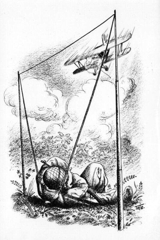 - Imagen de un soldado cubriéndose el rostro, tirado en el suelo ante la venida de una avioneta que se dirige hacia él, del soldado penden unas cuerdas atadas a dos palos laterales.