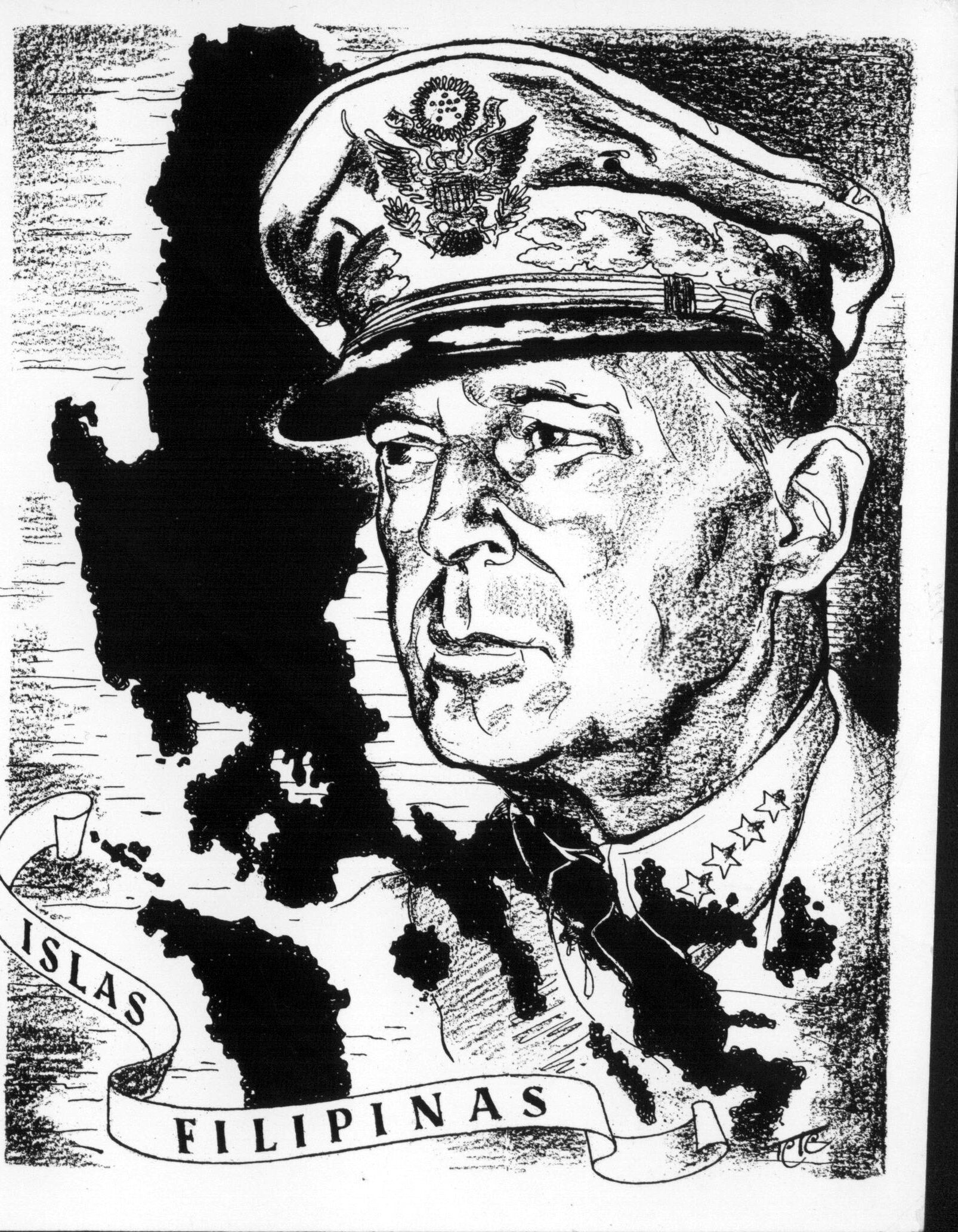 - En primer término el retrato del Comandante Mcarthur, quien estuvo al frente de la contienda en las Islas Filipinas durante la Segunda Guerra Mundial. El cartel tiene claros tintes épico-políticos.