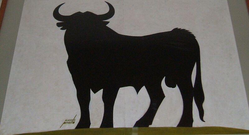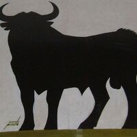 - Sobre un fondo blanco, la mítica silueta del toro Osborne que mira de frente (¿o de espaldas?) al espectador: es la misma que luego se llevaría a los grandes carteles, aunque con un simplificado en el torso del animal (obligaciones del contrachapado metálico) que disgustó al artista. Puede verse la presencia de la firma del autor en verde en las patas del toro.