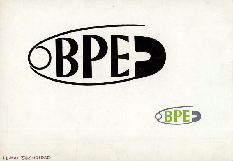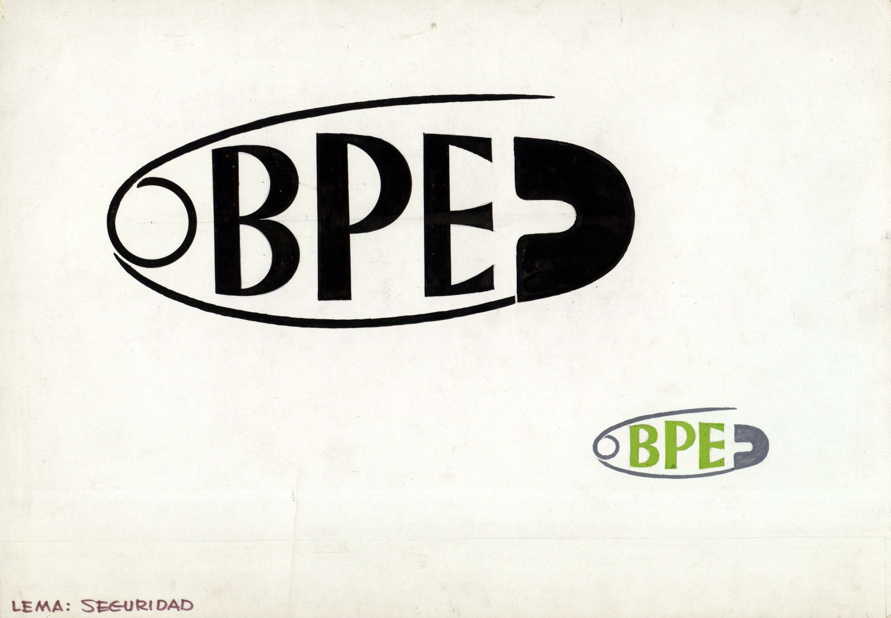 - Sobre un fondo blanco y bajo el lema de “seguridad” se han dibujado dos alfileres abiertos con las letras en su interior de “BPE”. El alfiler y las letras de la derecha algo más grandes que el de la izquierda son de color negro mientras que el segundo es gris con letras verdes. El soporte es rectangular.