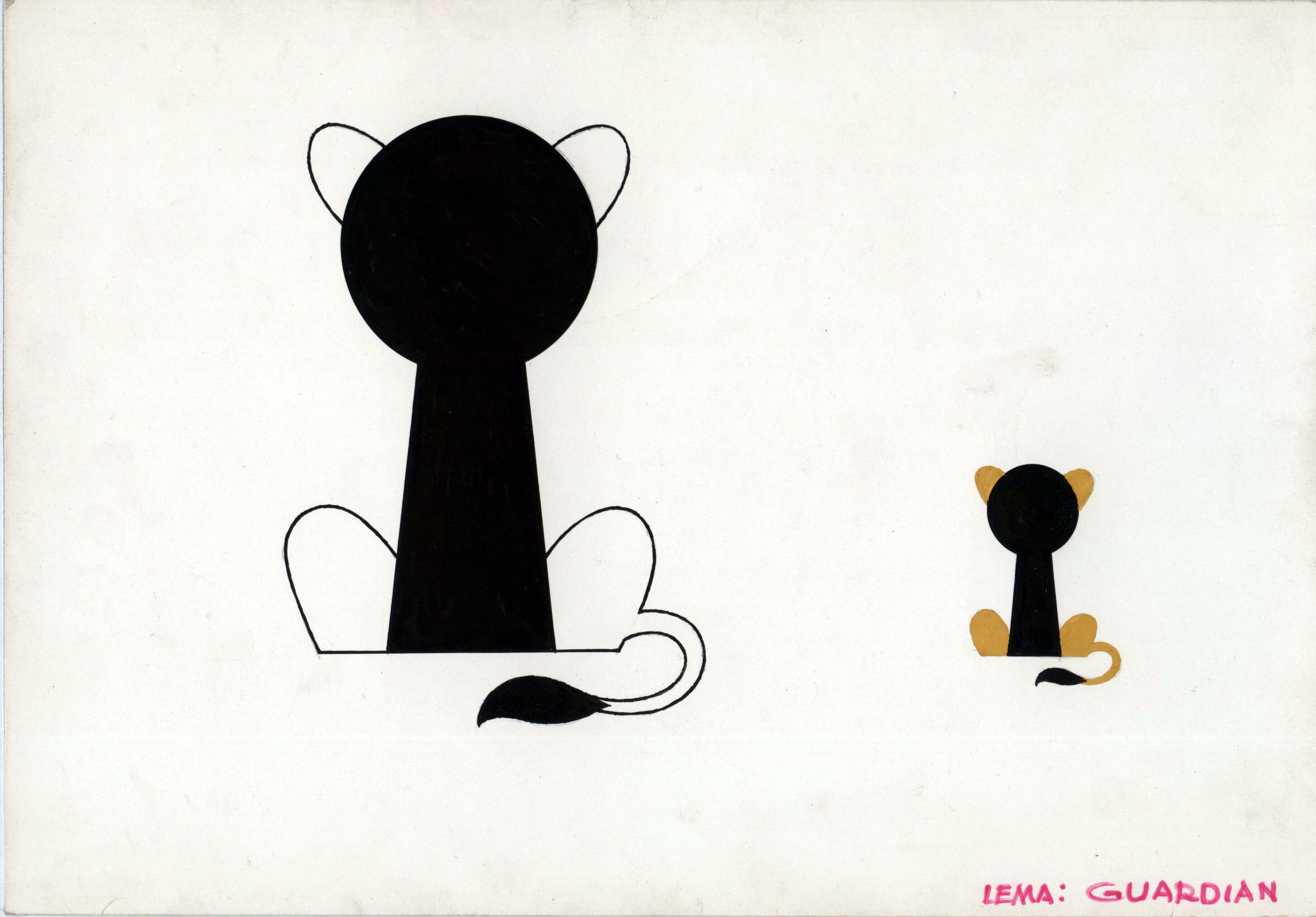 - Sobre un fondo blanco se han dibujado a dos gatos sentados y de espalda. El de la derecha, blanco y negro, es de un tamaño mayor que el de al izquierda, negro y marrón. La forma del soporte es rectangular y en letras rosas se ha titulado el dibujo como guardián.
