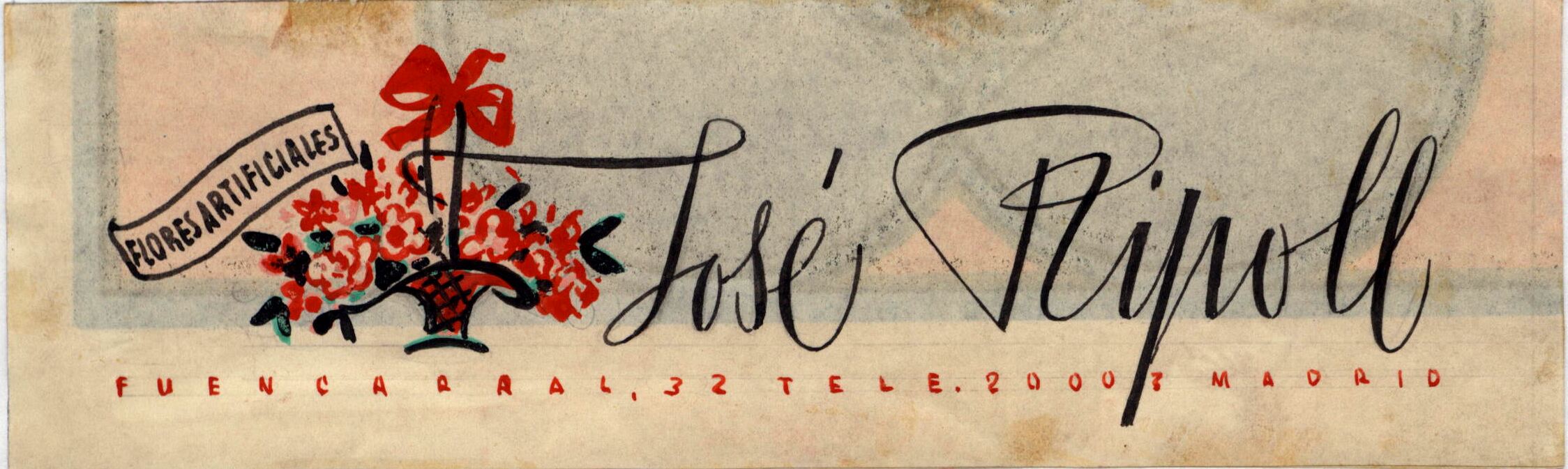 - Con el nombre de José Ripoll en color negro y en letra caligráfica se anuncia en este cartel comercial una tienda especializada en flores artificiales. Destaca sobre el soporte rectangular, a la derecha, un cesto con flores rojas. La dirección del centro se da en la parte inferior con letra muy pequeña y en color rojo.