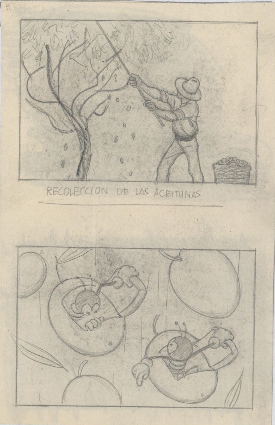 - Se han representado dos dibujos enmarcados. En el primero un hombre agita unas ramas de las que se desprenden las aceitunas. En el segundo unos insectos salen de las aceitunas. Destaca el color gris en los dibujos entre los que se encuentra el lema.
