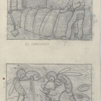 - Se pueden apreciar dos dibujos cada uno en su enmarque. En el primero se ve a un hombre en un granero ordenando las bolsas del grano y en el segundo a unos insectos con unos granos. Predominan en el dibujo los colores grises y el lema se coloca en medio de los dos dibujos.