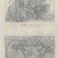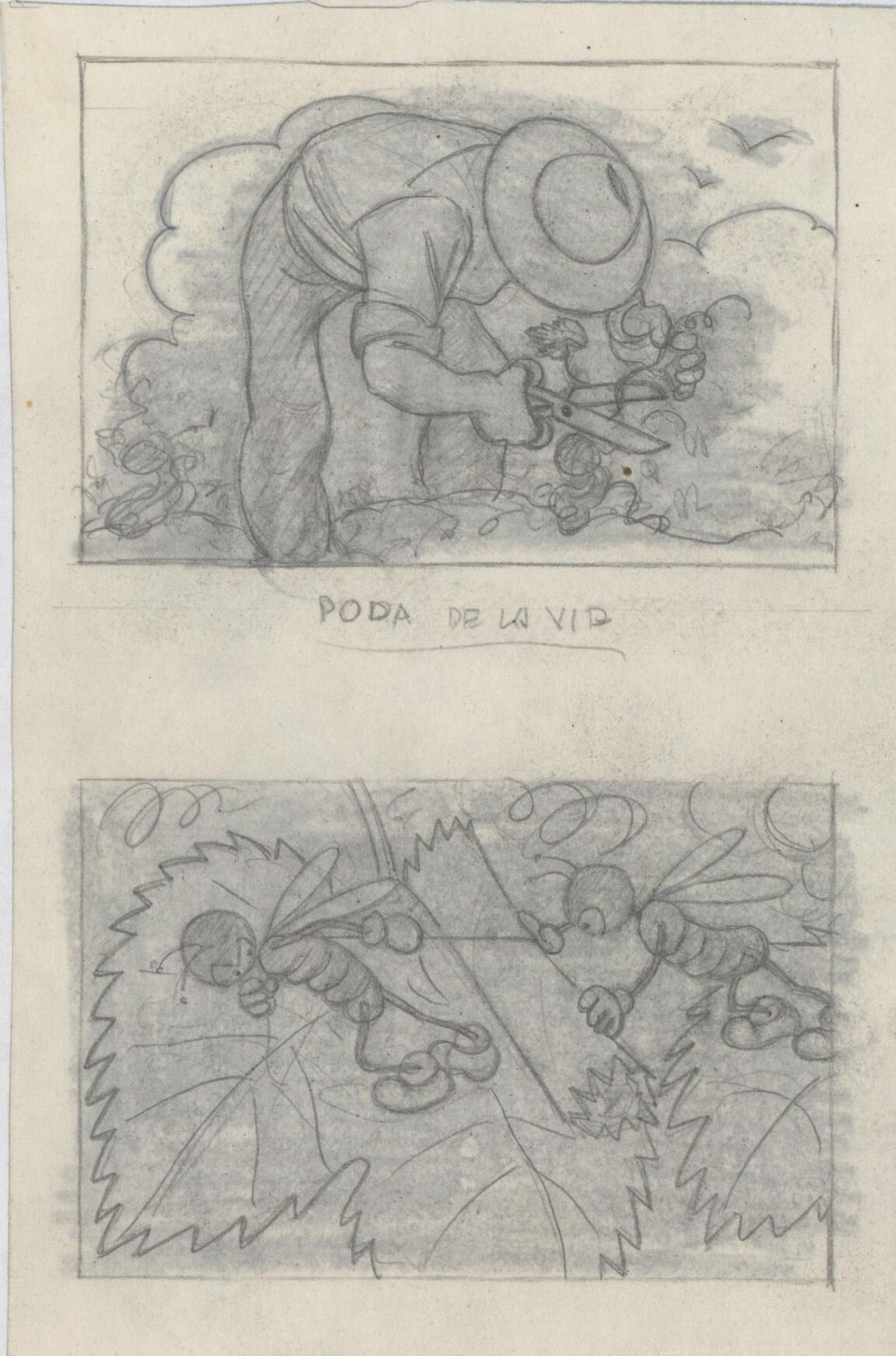 - En esta composición destacan dos dibujos enmarcados. En la parte superior un hombre realiza la poda de la vid. Y en la parte inferior dos insectos enrollan una hoja. Destacan las líneas grises sobre un fondo claro. El lema está colocado entre los dibujos.