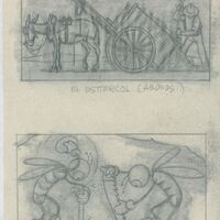 - En esta composición destacan dos dibujos enmarcados en tonos grises. En el primero un hombre deja caer de su carro el estiércol para abono de sus campos. En el segundo unos insectos trabajan el suelo. El lema se sitúa entre los dibujos.