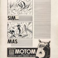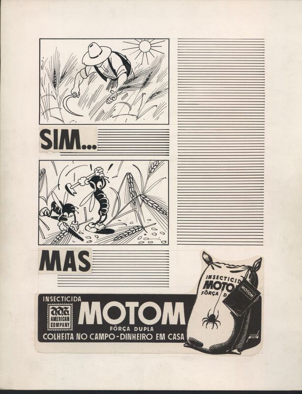 En este cartel publicitario se comercializa un producto llamado “motom” como se puede leer en la parte inferior sobre una franja de color negro sobre la que se ha dibujado un saco. Destacan líneas rectas en posición horizontal como también dos dibujos enmarcados. En la parte superior un hombre segando un campo bajo el lema “sim” y por debajo se ve bajo el lema “mas” unos insectos intentando arrancar las hojas por su raíz. Sobre un fondo claro predominan líneas oscuras. En la esquina de la parte inferior izquierda está presente la firma del pintor en color blanco.
