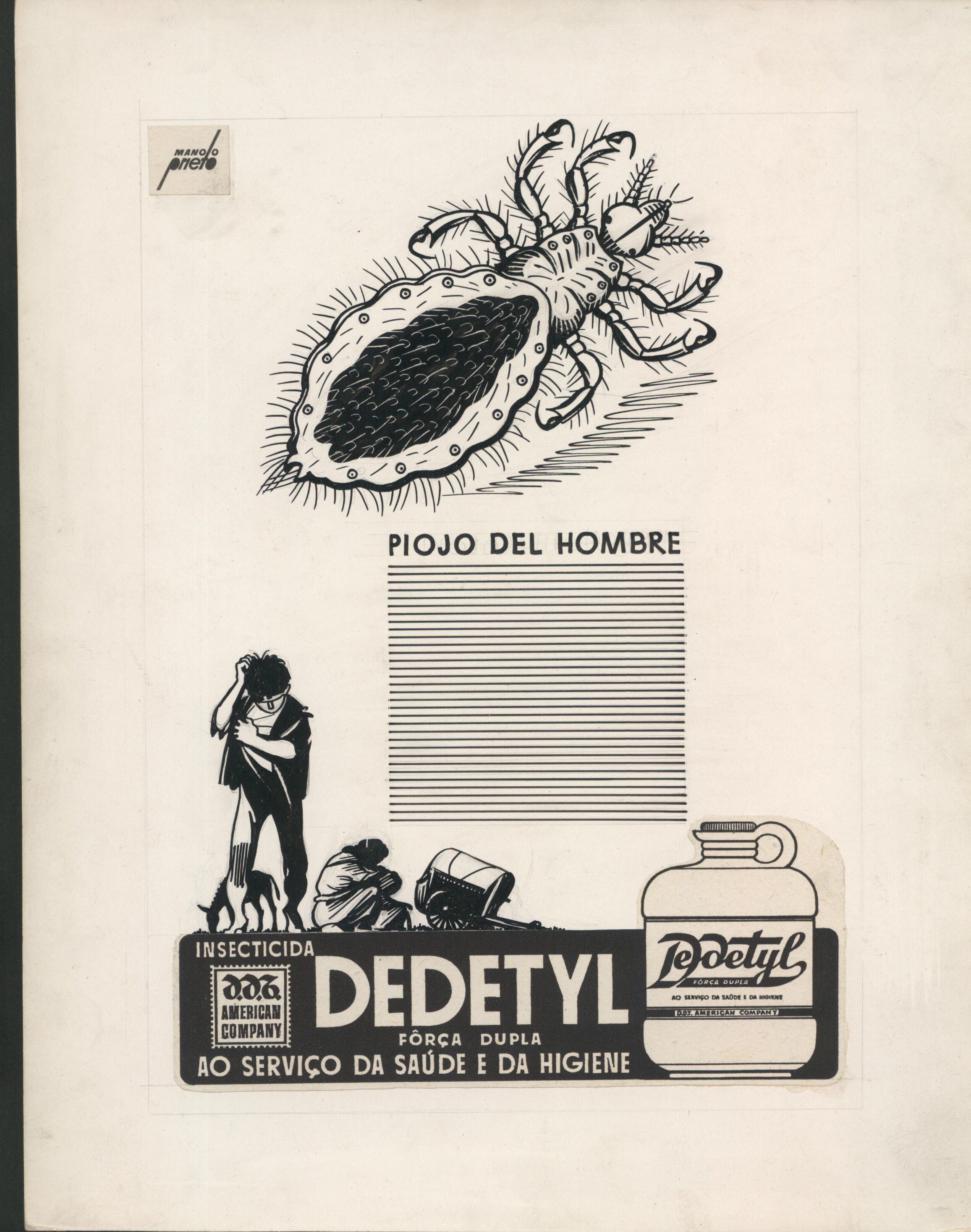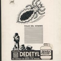 - Bajo el lema de “dedetyl” en la parte inferior se quiere anunciar un producto contra los insectos como el que se puede observar en el centro del cartel publicitario en color negro, un piojo de hombre. Destacan las líneas oscuras sobre un fondo claro. Se puede apreciar, también, la firma del autor en la parte superior de la derecha.