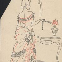 - Dibujo a lápiz negro y rojo, con la imagen de una mujer vestida de época de espaldas al espectador, sujetando un abanico en su mano frente a un tocador con jarrón de flores rojas y la silueta de un espejo.