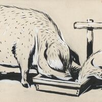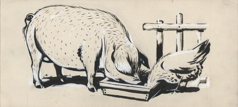 - Dibujo con trazos en blanco y negro, que representa a un cerdo y una gallina en una simpática imagen, comiendo juntos del mismo recipiente, compartiendo comida sin problemas.