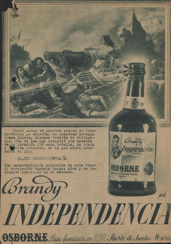 - Recorte de un periódico con una anuncio de Prieto. En la parte superior se puede apreciar una escena bélica de la guerra de Independencia contra los franceses, debajo una leyenda escrita con letras de imprenta y a su lado una botella de Brandy.