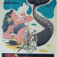 - Imagen de un cartel en color en que aparece una sirena debajo del mar bebiendo un refresco cómodamente junto la imagen de una botella de anís, de sifón, un vaso y hielos.