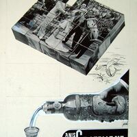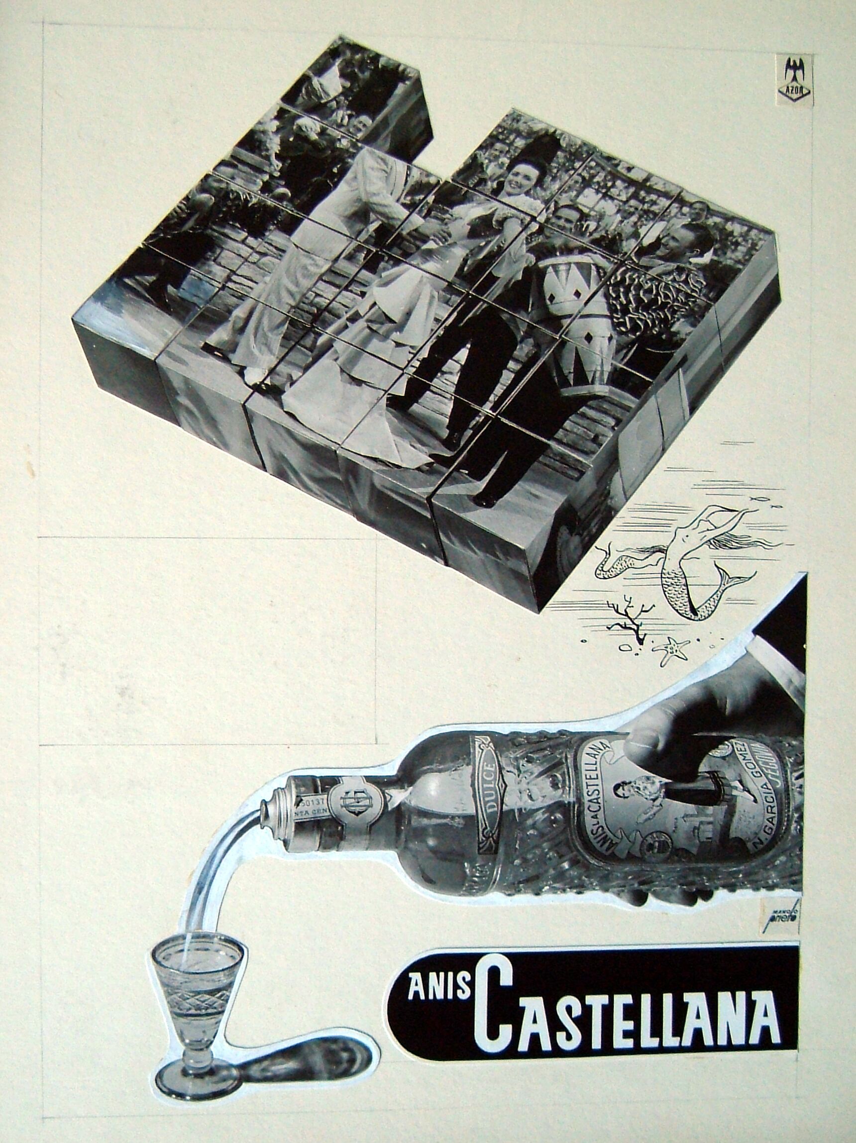 - Cartel compuesto por una mano que sujeta una botella de anís, y encima la imagen de una película formada por cubos de cuatro caras, que representan la escena de una mujer en un escenario bailando.