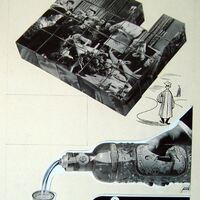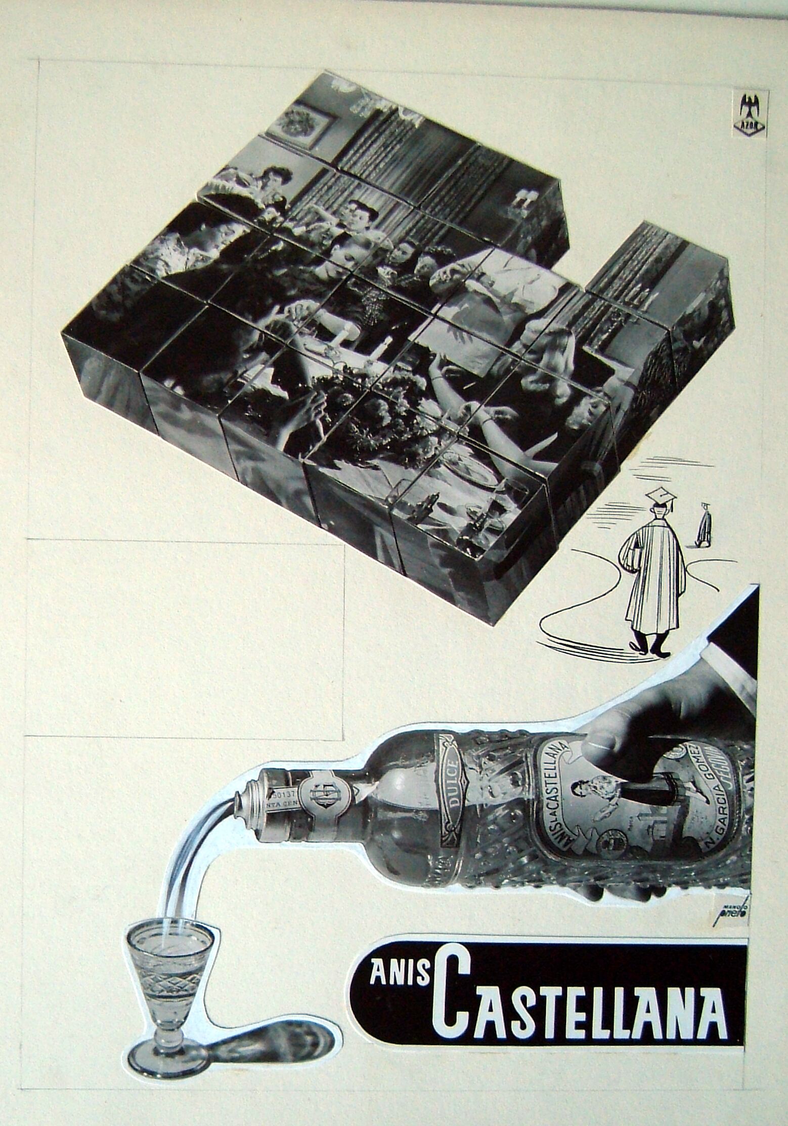 - Cartel compuesto por una mano que sujeta una botella de anís, y encima la imagen de una película formada por cubos de cuatro caras, que representan la escena de un grupos de mujeres en un salón mirando simultáneamente sus relojes.