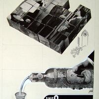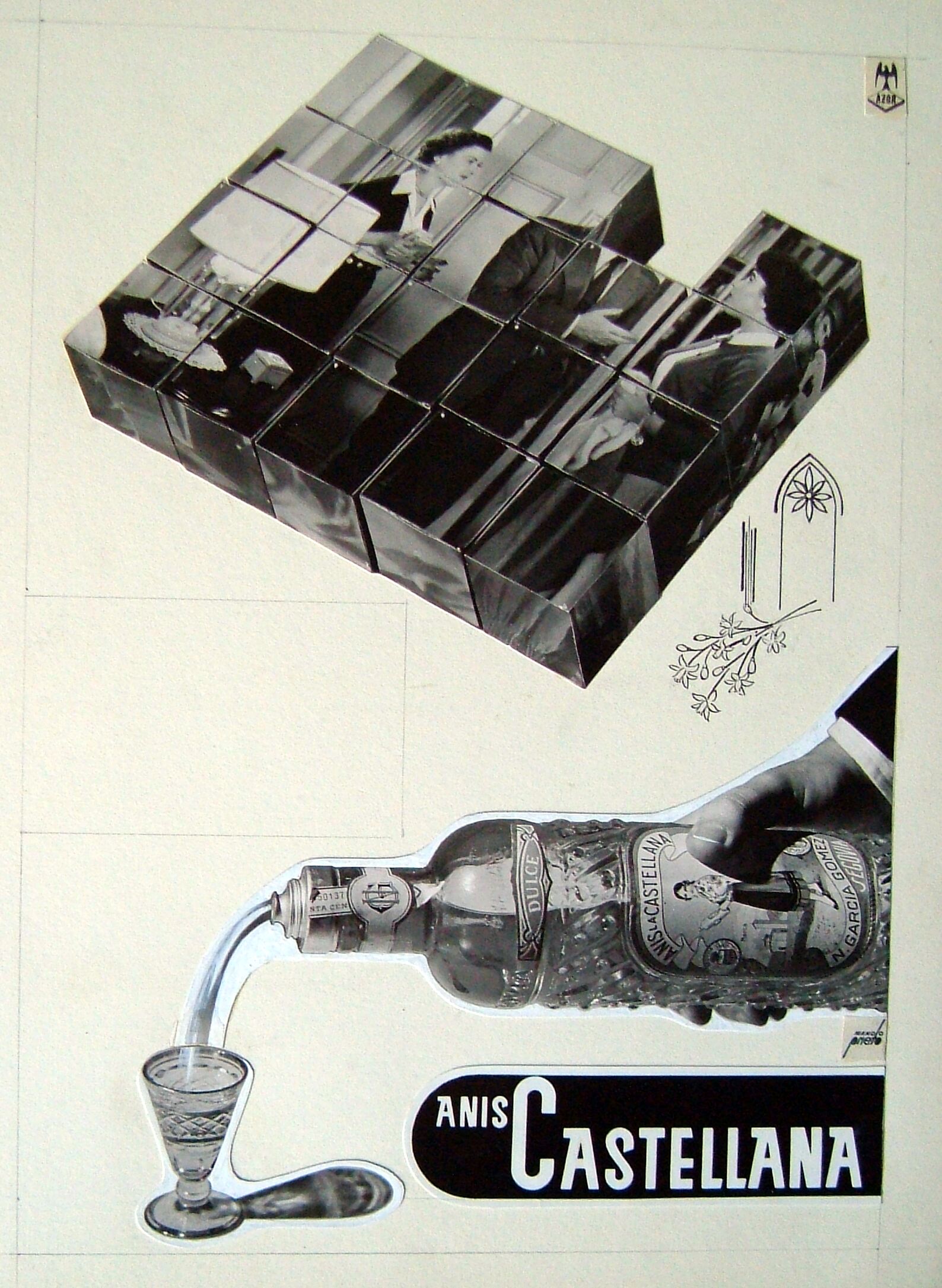 - Cartel compuesto por una mano que sujeta una botella de anís, y encima la imagen de una película formada por cubos de cuatro caras, que representan la escena de dos mujeres y un hombre de pie hablando entre sí en el salón de una casa.