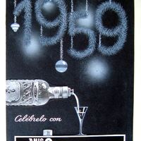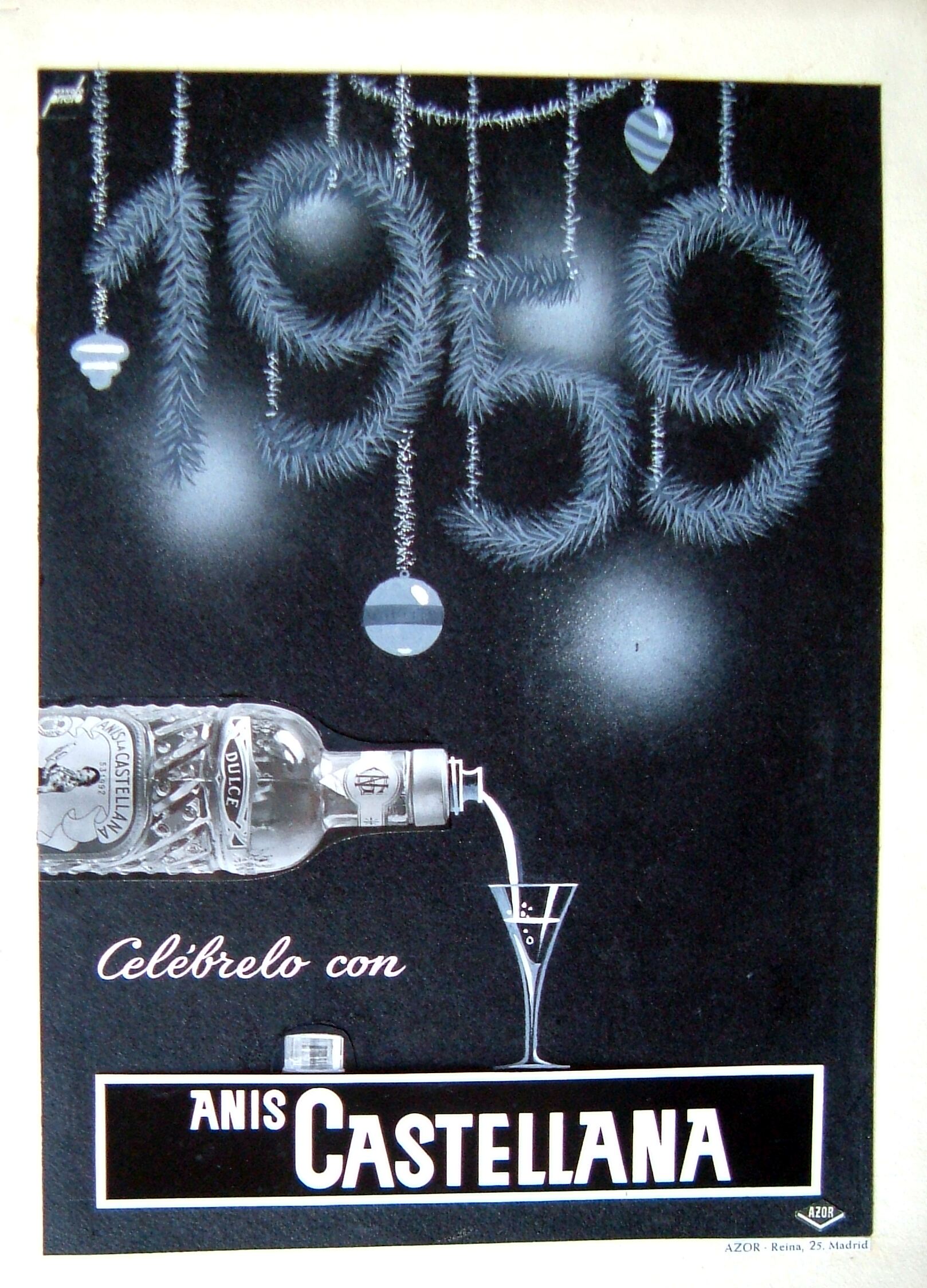 - Anuncio publicitario de Fin de Año, sobre un fondo oscuro los números del año 1956, en forma de espumillón adornados con bolas de Navidad, y en primer término una botella de anís llenando una copa.