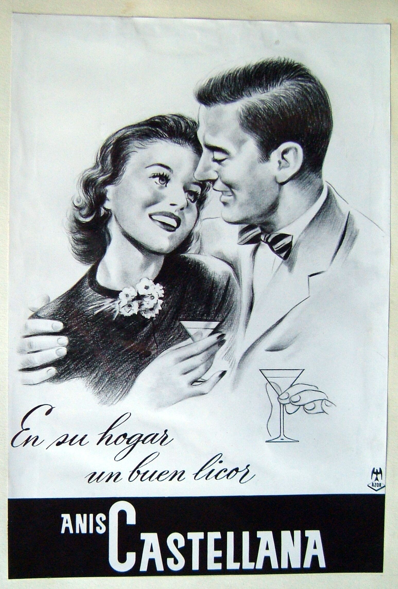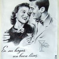 - Cartel sobre fondo claro, con la imagen de una mujer que mira encantada al hombre que la coge con su brazo mientras sujeta una copa en su mano, debajo se puede leer “En un hogar un buen licor”.