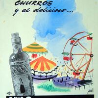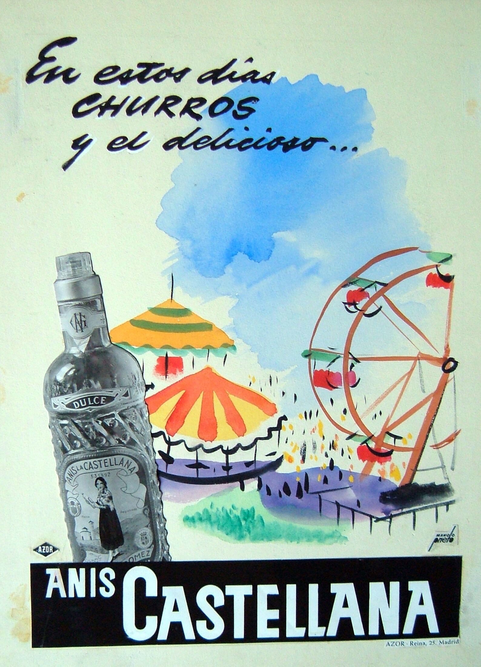 - Cartel colorista donde en primer término aparece una botella de anís castellana, y detrás la vista de una feria, con el gentío, una gran noria, y diferentes carpas de rayas una de ellas correspondiente a un tiovivo.