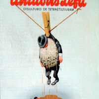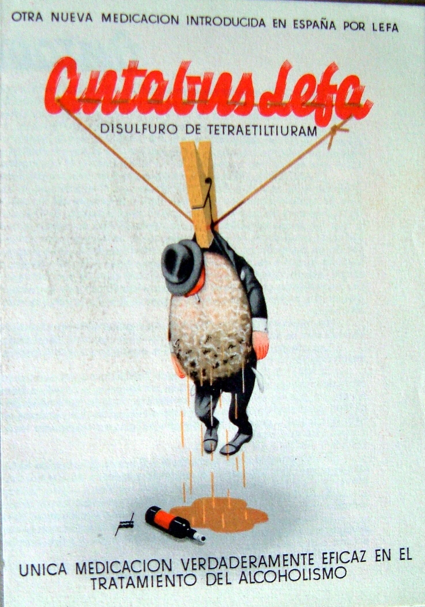 - Cartel de un nuevo medicamento contra el alcoholismo de los laboratorios Lefa, con la imagen de un hombre ebrio colgado de una cuerda por una pinza, para eliminar todo el alcohol que le sobra que cae formando un charco bajo él.Publicidad realizada para unos laboratorios.