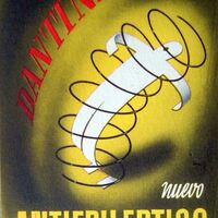 - Cartel de un nuevo medicamento contra el mareo de los laboratorios Lefa, con la imagen de un muñeco de papel en blanco rodeado por una espiral negra que simula la sensación que produce estar mareado.