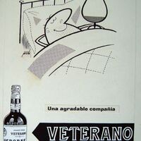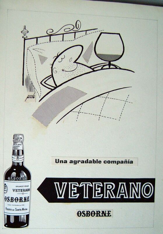 - Imagen de un hombre caricaturizado en la cama rodeando con su brazo a una gran copa, debajo se puede leer “la mejor compañía Veterano Osborne”.