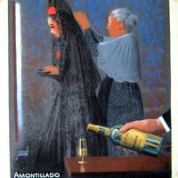 - Dibujo que representa la imagen de dos mujeres, una de ellas vistiéndose con mantilla y peineta y la otra mujer mayor ayudándola a vestirse, en un primer término la mano de un hombre sujetando una botella que inclina para llenar la copa que está sobre la mesa.