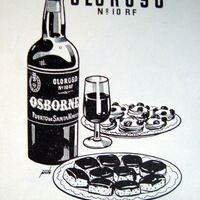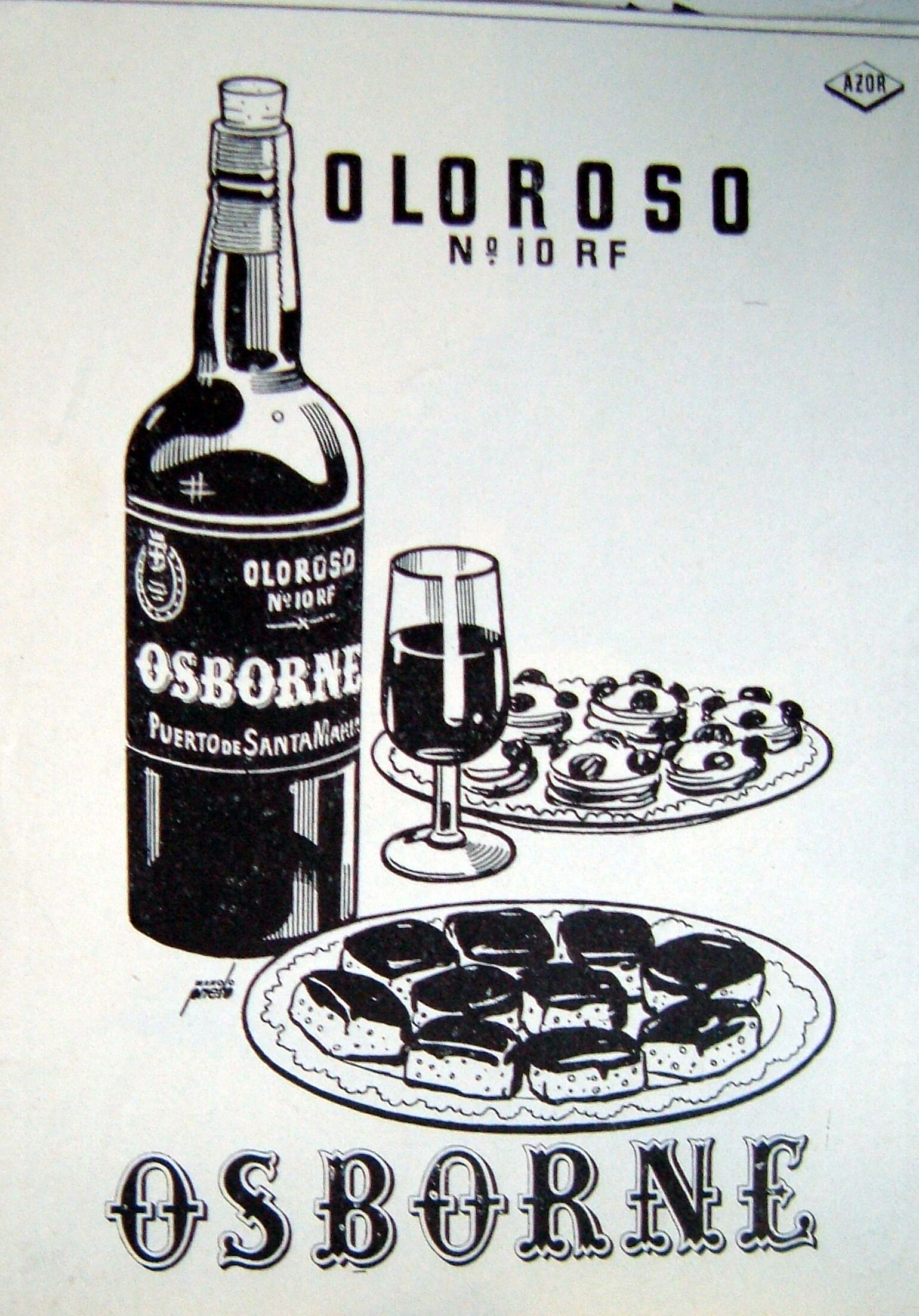 - Cartel en blancos y negros, de una botella de Oloroso Osborne junto a una copa y unas bandejas canapés.