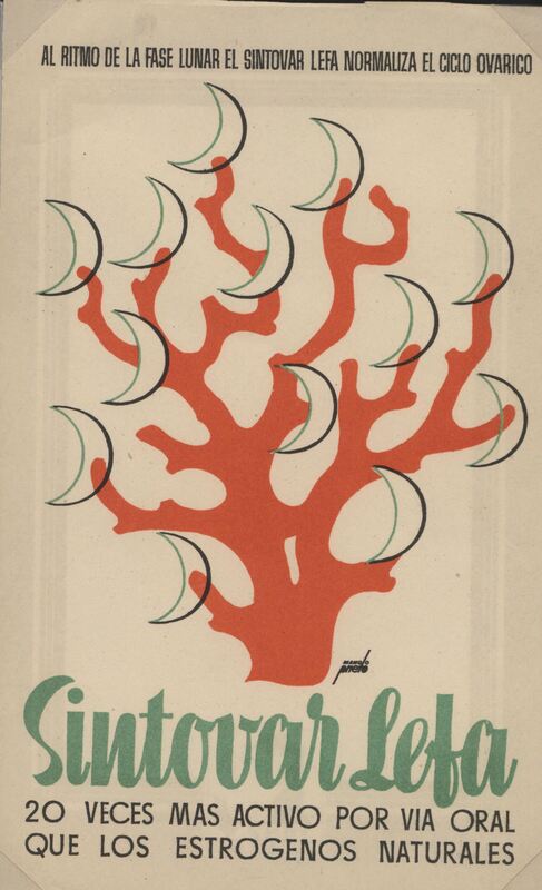 - Cartel muy colorista, con un gran árbol en rojo (¿o podría ser un gran coral rojo?) de cuyas ramas cuelgan unas pequeñas lunas crecientes, debajo el rótulo explicativo del cartel en tonos verdes y negros.