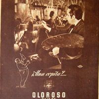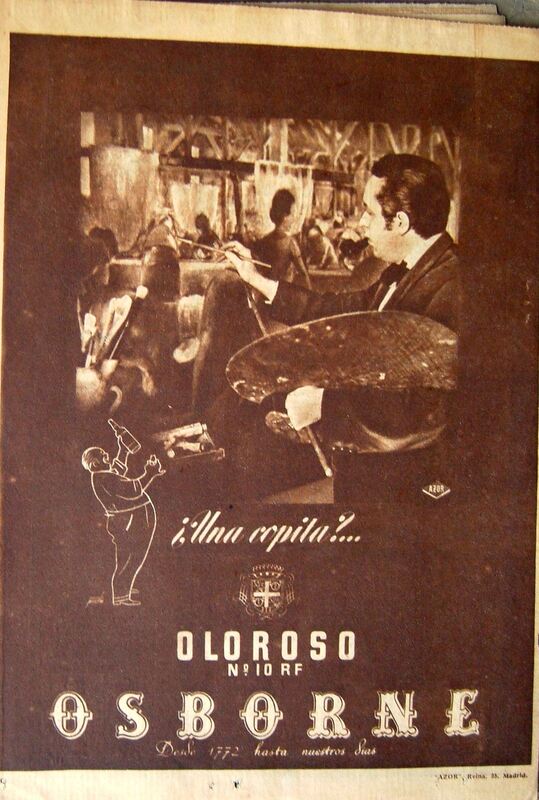 - Cartel compuesto por la imagen real de un hombre pintando un cuadro, en cuya mano sujeta una paleta mientras en la otra utiliza el pincel, debajo la leyenda correspondiente al cartel con la silueta pequeña de un hombre de gran panza y aptitud simpática ofreciendo una copita al pintor.