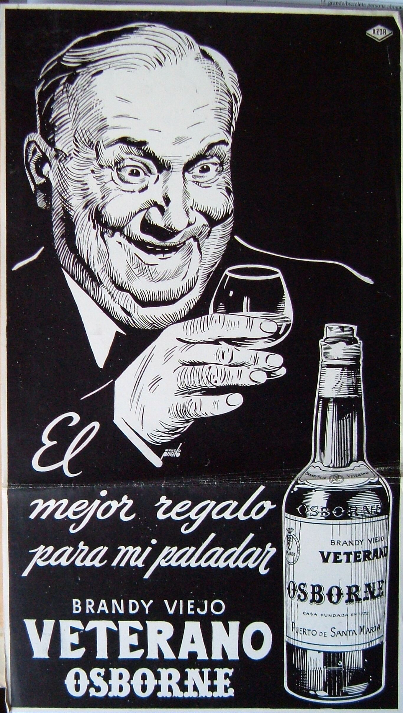 - Sobre un fondo negro, la figura sonriente de un hombre maduro levantando su copa en aptitud de agradecimiento hacia la botella que está frente a él, como brindando alegremente con ella.