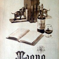- Cartel con una composición en blancos y negros, en primer término un libro abierto, detrás una botella de Magno y al fondo la imagen de dos sujetas libros en forma de elefantes soportando tres libros.