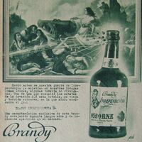 - Imagen con textura de papel de periódico, compuesta por un cuadro que representa una batalla de la guerra de la Independencia, librada contra los franceses, debajo un texto escrito con letras de imprenta a junto la imagen de una botella.