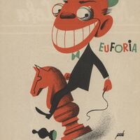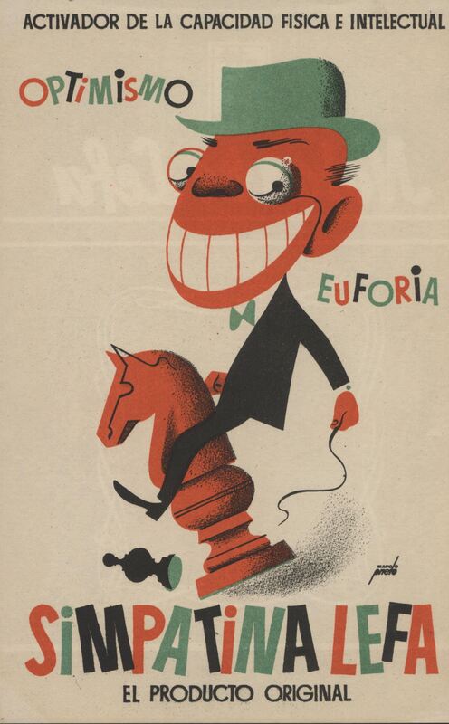 - Simpático cartel de la figura de un hombre de gran sonrisa con sombrero verde sobre un caballo de ajedrez, que con su pie tira un alfil acompañado por las palabras euforia y optimismo, debajo el rótulo del cartel correspondiente a la marca publicitaria anunciada.